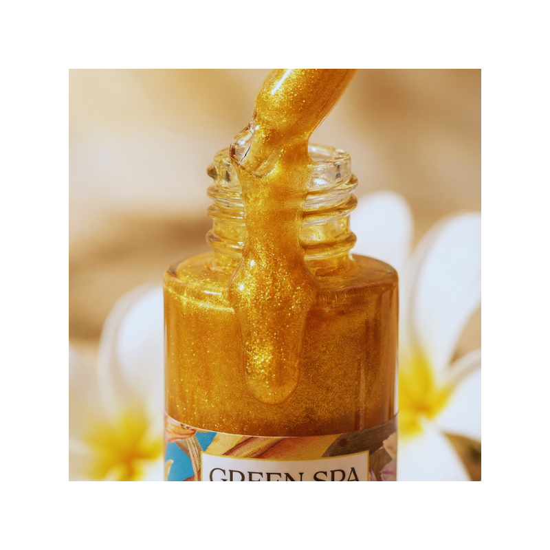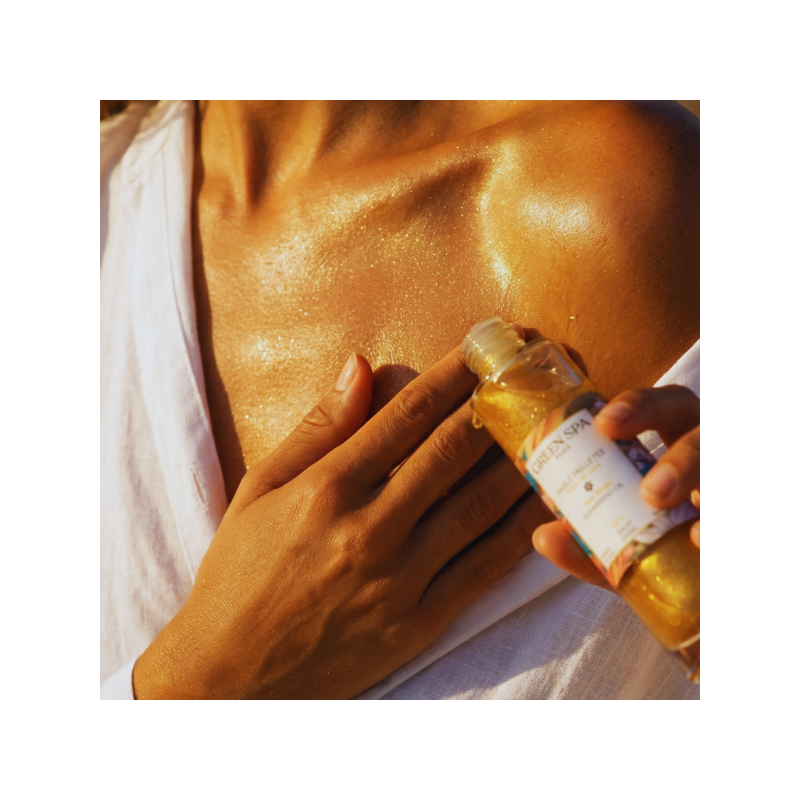 Un glow nourrissant pour une peau sublimée tout l’été. Cette huile pailletée offre un éclat subtil et élégant tout en nourrissant la peau en profondeur. Sa texture légère laisse un voile délicatement parfumé, illumine le bronzage et apporte un glow naturel, sans effet gras, pour une peau douce, satinée et rayonnante.